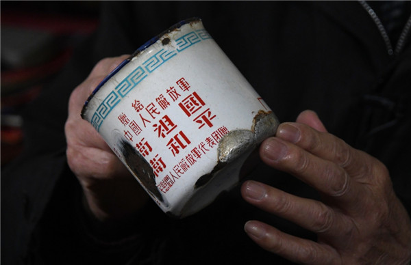 多年來(lái),他只是小心翼翼地,把1954年“全國(guó)人民慰問(wèn)人民解放軍代表團(tuán)”頒發(fā)的一個(gè)搪瓷缸,擺在觸手可及的地方。這只補(bǔ)了又補(bǔ)、不能再用的缸子上,一面是天安門(mén)、和平鴿,一面寫(xiě)著:贈(zèng)給英勇的中國(guó)人民解放軍——保衛(wèi)祖國(guó)、保衛(wèi)和平。