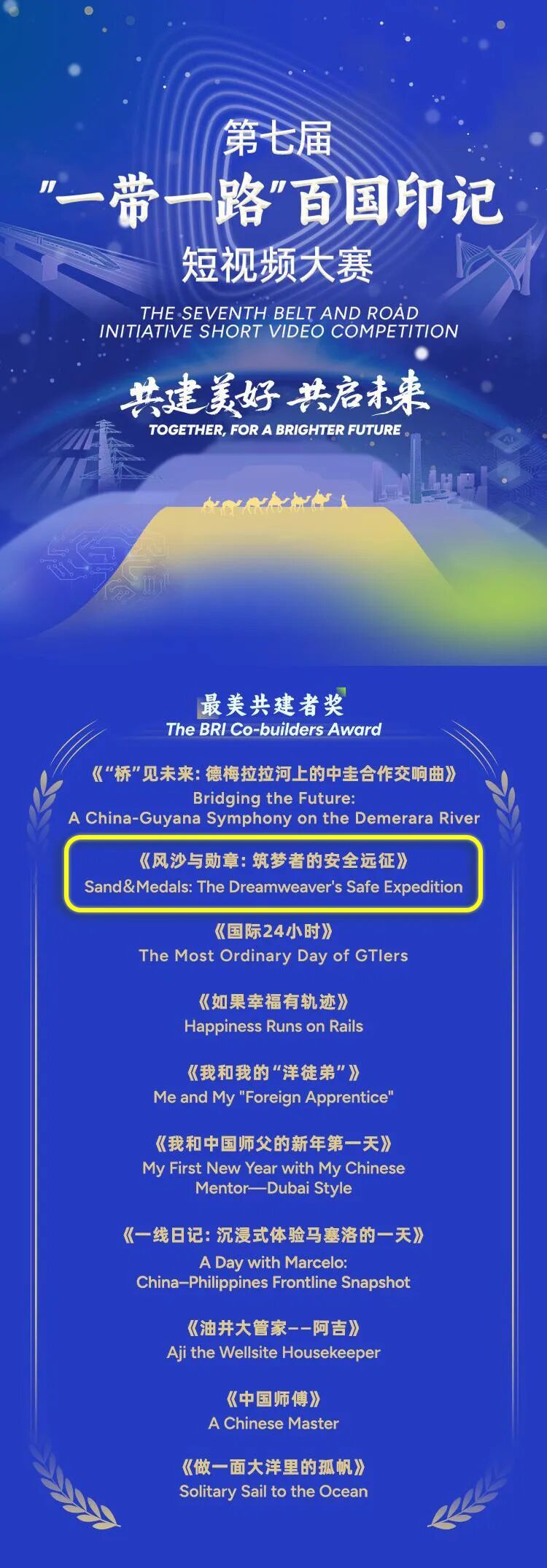 日前,由中國(guó)公共外交協(xié)會(huì)、環(huán)球網(wǎng)聯(lián)合主辦,國(guó)務(wù)院國(guó)資委新聞中心、中國(guó)駐柬埔寨王國(guó)大使館、柬埔寨王國(guó)駐華大使館、中國(guó)駐南非共和國(guó)大使館、中國(guó)駐保加利亞共和國(guó)大使館、中國(guó)駐塞爾維亞共和國(guó)大使館支持的第七屆“一帶一路”百國(guó)印記短視頻大賽落下帷幕,大賽以“共建美好,共啟未來(lái)”為主題,吸引了來(lái)自全球130余個(gè)國(guó)家和地區(qū)的近2000部作品參賽。經(jīng)過(guò)激烈角逐,共有161部作品脫穎而出,哈電集團(tuán)短視頻作品《風(fēng)沙與勛章:筑夢(mèng)者的安全遠(yuǎn)征》榮獲“最美共建者”獎(jiǎng)。
