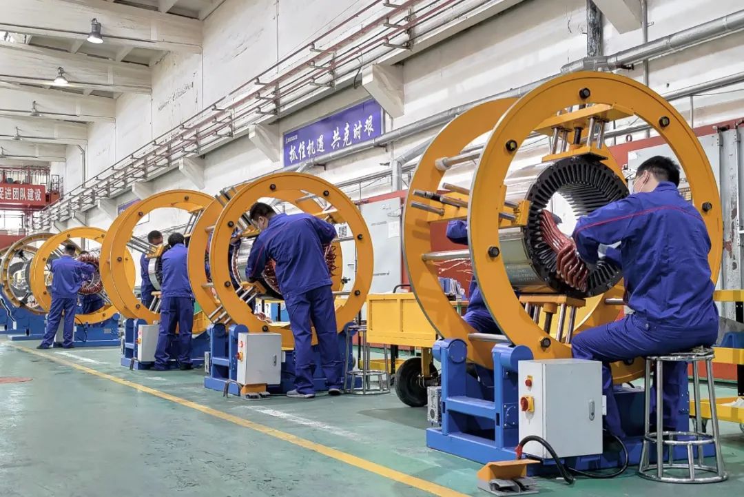 哈電集團(tuán)佳電股份電工車間有繞組定子鐵芯嵌線操作現(xiàn)場(chǎng)