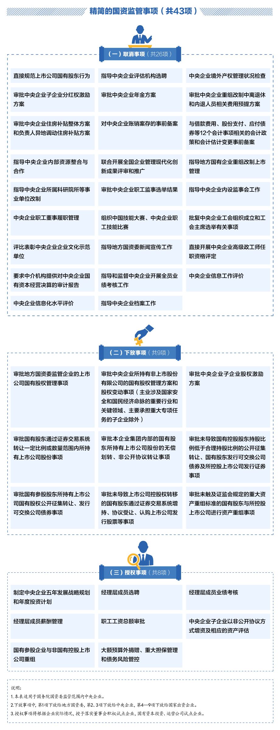 | 黨的十八大以來,國務(wù)院國資委認(rèn)真貫徹落實黨中央、國務(wù)院關(guān)于深化國有企業(yè)改革的決策部署,準(zhǔn)確把握國有資產(chǎn)監(jiān)管機構(gòu)的出資人代表職責(zé)定位,堅定不移深化國有企業(yè)改革,探索完善國有資產(chǎn)監(jiān)管體制機制,積極推進國有企業(yè)結(jié)構(gòu)調(diào)整、創(chuàng)新發(fā)展,為實現(xiàn)國有資產(chǎn)保值增值、防止國有資產(chǎn)流失、發(fā)展壯大國有經(jīng)濟作出了積極貢獻(xiàn)。但與此同時,國有資產(chǎn)監(jiān)督機制尚不健全,國有資產(chǎn)監(jiān)管中越位、缺位、錯位問題依然存在,亟需加快調(diào)整優(yōu)化監(jiān)管職能和方式,推進國有資產(chǎn)監(jiān)管機構(gòu)職能轉(zhuǎn)變,進一步提高國有資本運營和配置效率。4月27日,國務(wù)院辦公廳轉(zhuǎn)發(fā)《國務(wù)院國資委以管資本為主推進職能轉(zhuǎn)變方案》,明確提出調(diào)整優(yōu)化國資監(jiān)管職能,改進監(jiān)管方式手段,著力提高國有資本效率,增強國有企業(yè)活力。文件還明確了精簡的國資監(jiān)管事項共43項。 |