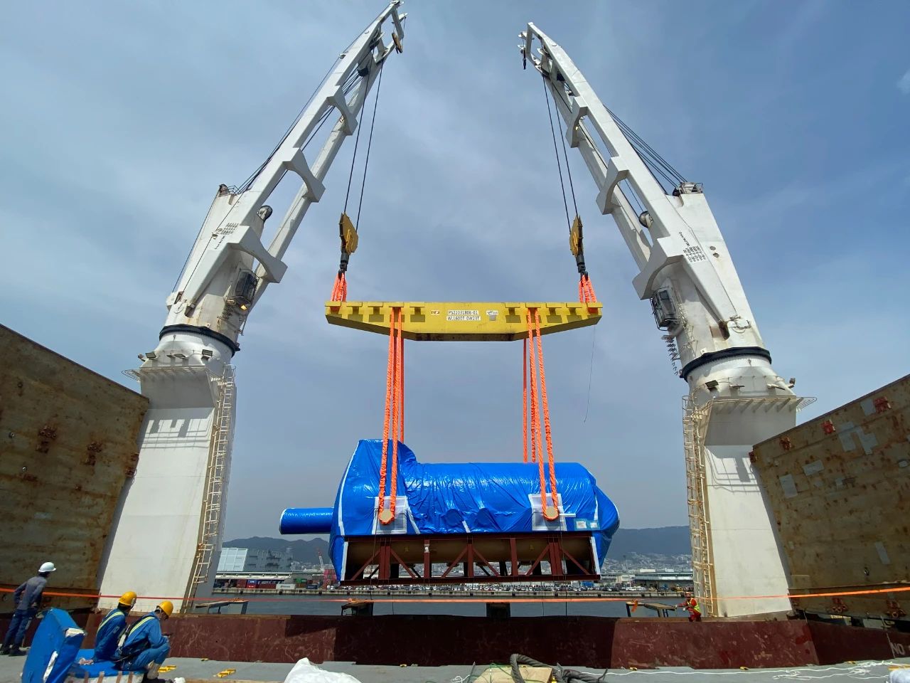 此次發(fā)運燃機重量達517噸,是哈電國際發(fā)運單體重量最大的設(shè)備,采用起吊能力達640噸的重吊船抬吊操作裝船。為確保操作過程絕對安全,哈電國際物流管理團隊在啟運前與物流分包商精心規(guī)劃操作方案,嚴格審核技術(shù)細節(jié),對設(shè)備包裝、吊點重心、結(jié)構(gòu)尺寸等細節(jié)與設(shè)備廠家充分交流,確保滿足核心設(shè)備裝船、綁扎、運輸過程的安全要求,同時積極協(xié)調(diào),跟蹤對接船、貨狀態(tài)。最終按照發(fā)運計劃和操作方案要求,順利完成裝船發(fā)運。