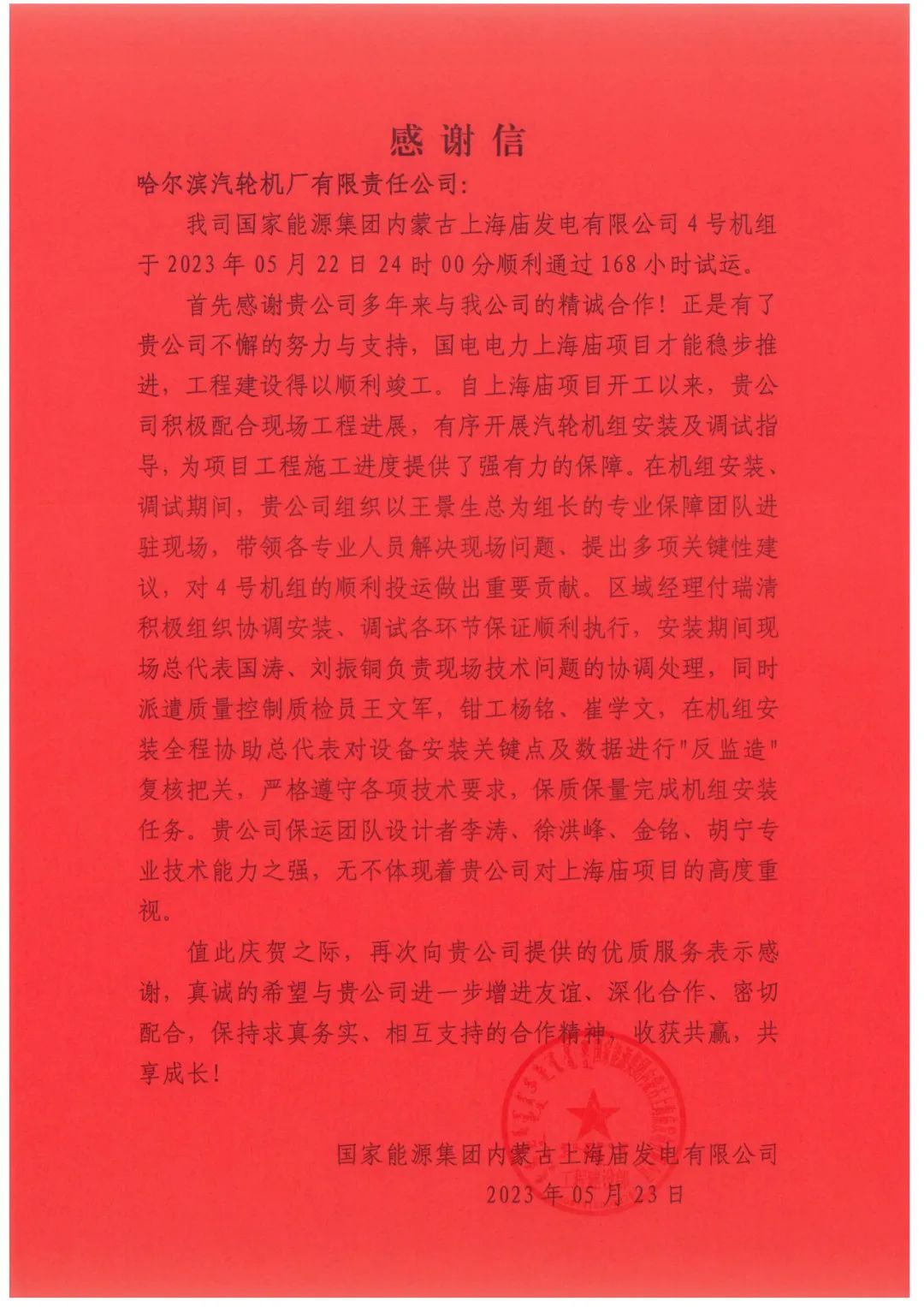 2023年5月22日24時(shí)00分,由哈電集團(tuán)哈電汽輪機(jī)設(shè)計(jì)制造的國(guó)家能源集團(tuán)內(nèi)蒙古上海廟發(fā)電有限公司4號(hào)汽輪機(jī)組順利通過(guò)168小時(shí)試運(yùn)行考核,正式投入商業(yè)運(yùn)營(yíng),標(biāo)志著國(guó)內(nèi)在建最大煤電項(xiàng)目4臺(tái)超超臨界百萬(wàn)千瓦機(jī)組全部投產(chǎn)發(fā)電。