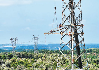 江西500千伏吉安南輸變電工程是江西省重點(diǎn)工程,投運(yùn)后可加強(qiáng)該省吉安市南部電網(wǎng)與吉安主網(wǎng)聯(lián)絡(luò),提升新能源電力消納能力。圖為日前在該項(xiàng)目施工現(xiàn)場,電力工人正在高空進(jìn)行輸電鐵塔架設(shè)安裝作業(yè)。