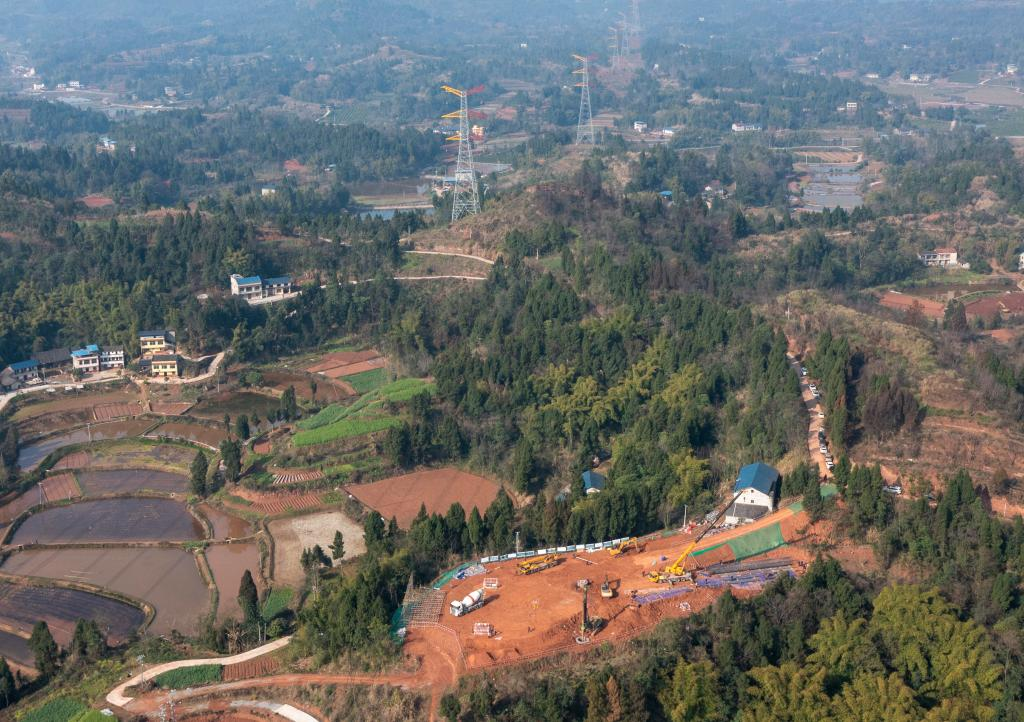 川渝1000千伏特高壓交流工程施工現(xiàn)場,一片繁忙景象(無人機照片)。新華社記者劉潺 攝