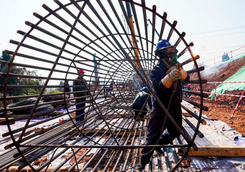 在重慶市潼南區(qū)小渡鎮(zhèn)川渝1000千伏特高壓交流工程施工現(xiàn)場,工人進行焊接作業(yè)。新華社記者劉潺 攝