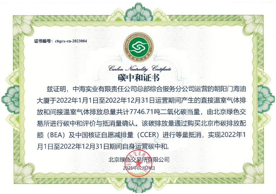 北京綠色交易所按照制定碳中和計劃、實施減排行動、碳排放核算、北京碳配額及CCER等量抵消,“碳中和”評價和聲明等全流程要求,支持中國海油總部大樓實現(xiàn)年度自身運營“碳中和”目標,并頒發(fā)“碳中和”證書。