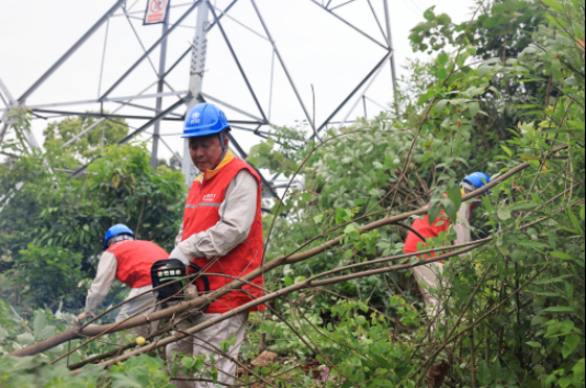 國網重慶電力員工在500千伏洪板一線237號塔附近修剪樹竹。
