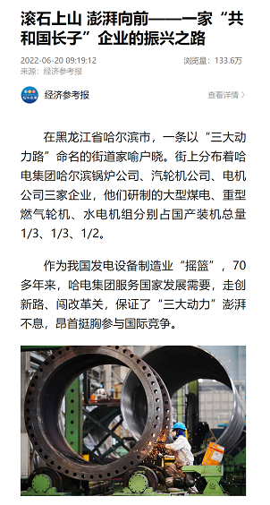新華社多個平臺講述哈電故事:新華社客戶端、《新華每日電訊》刊發(fā)《我國發(fā)電設備制造業(yè)“搖籃”哈電集團競逐“綠色賽道”》《哈電集團穩(wěn)步推進高質量發(fā)展》等多篇文章;新華社刊發(fā)《哈電集團探索自主創(chuàng)新走出“換擋加速”新路》《“大國重器”企業(yè)轉型面臨多重挑戰(zhàn)》等文章。經(jīng)濟參考報專版刊發(fā)《滾石上山 澎湃向前——一家“共和國長子”企業(yè)的振興之路》閱讀量近140萬。