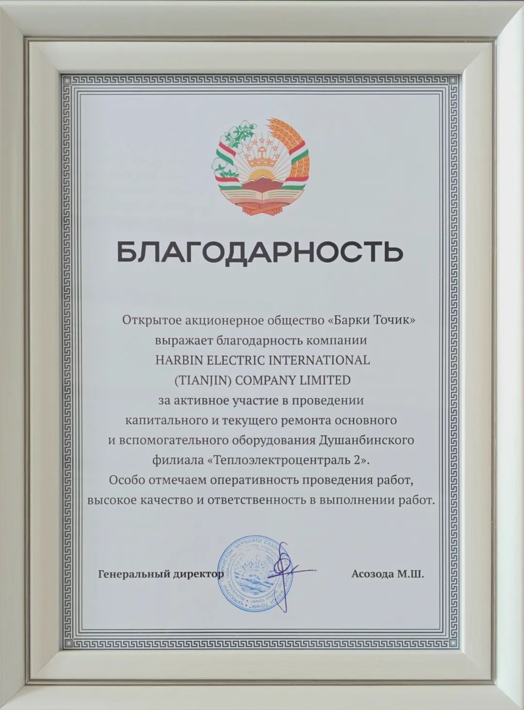 近日,哈電國(guó)際收到塔吉克斯坦共和國(guó)電力公司發(fā)來的感謝信,對(duì)哈電國(guó)際在杜尚別2號(hào)電廠檢修工作中展現(xiàn)的專業(yè)能力與責(zé)任擔(dān)當(dāng)給予高度評(píng)價(jià)。