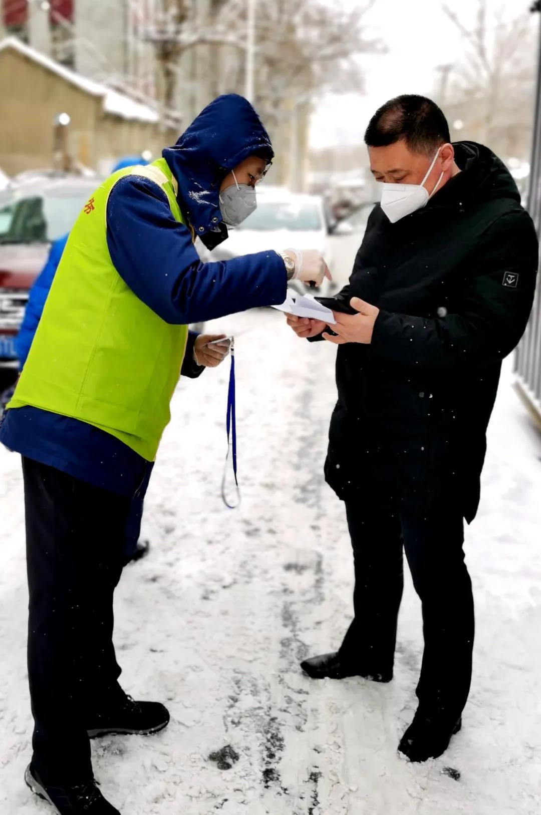 第二天是周六,一大早他早早起床,加入到樂園社區(qū)防疫檢查站卡點(diǎn)志愿服務(wù)工作中,給出入小區(qū)的人員測量體溫,做好登記。此時(shí),天空中飄起了雪花,雪越下越大,他依然矗立在崗位上,忙碌著,手凍僵了他就攥攥拳頭、腳冷了就踮起腳尖跺跺,一刻不停的工作。社區(qū)的工作人員跟他說可以輪班站崗,冷了累了就進(jìn)屋歇一歇,換其他人站崗,都被他拒絕了?!捌綍r(shí)工作忙,也沒能第一時(shí)間來社區(qū)做志愿者,今天總算有空,時(shí)間寶貴,能多干一些就多干一些!”社區(qū)的工作人員都豎起了大拇指,對他稱贊有加,他卻一臉嚴(yán)肅的說:“我家也住這附近,為大家其實(shí)就是為我家。在這場疫情防控阻擊戰(zhàn)中,全國人民都是一家人。