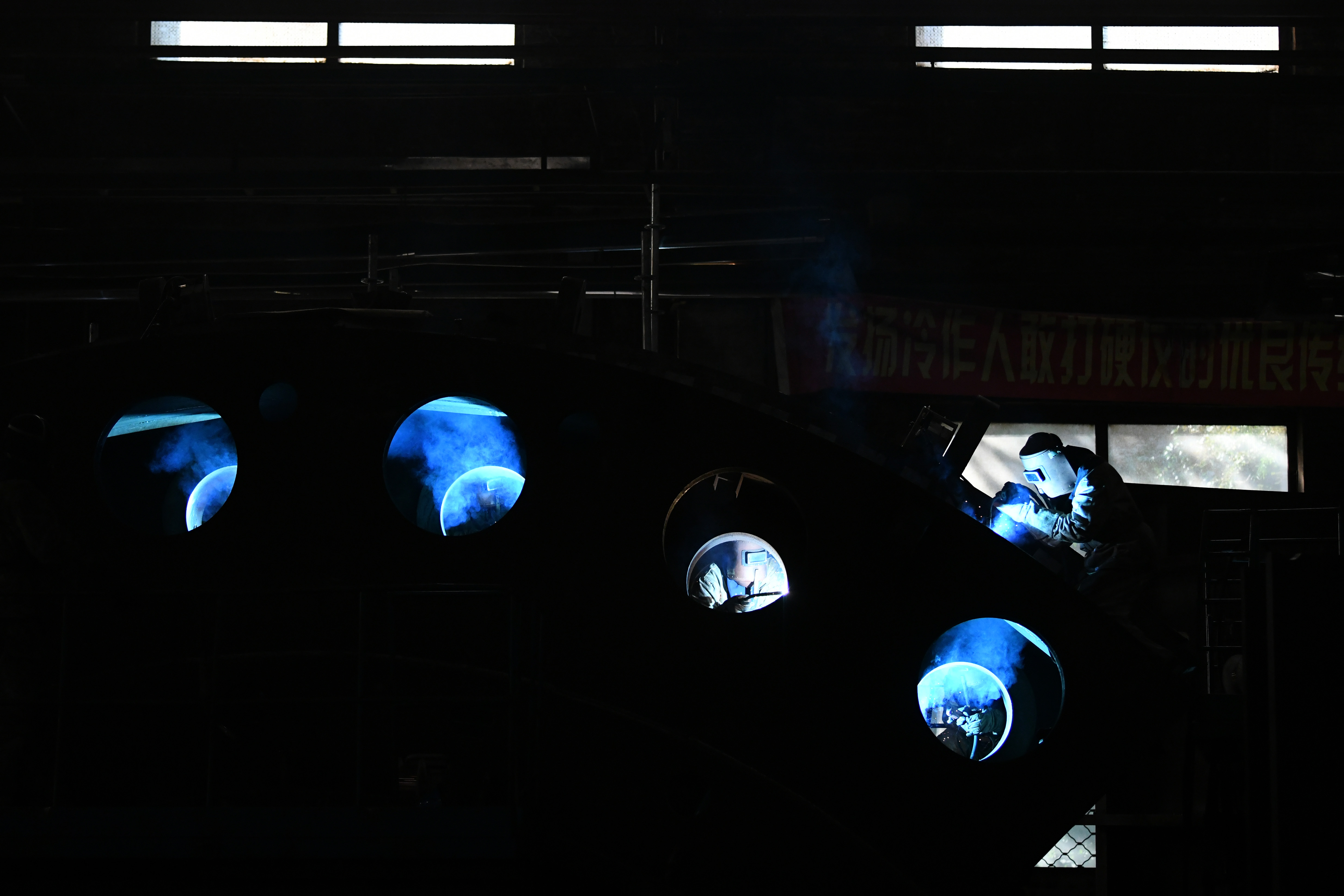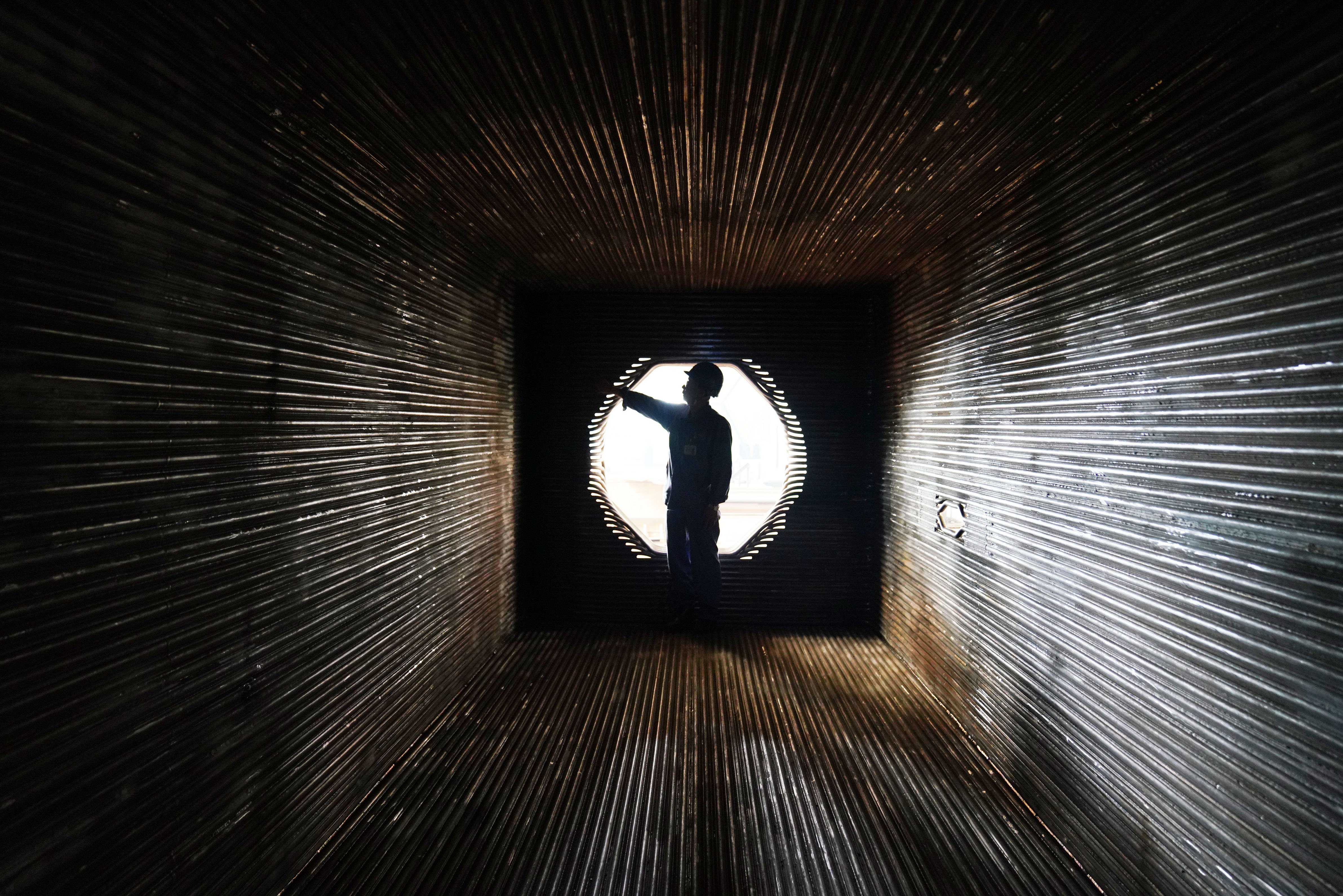 ↑在哈電集團哈爾濱鍋爐廠有限責任公司廠房內(nèi),工人在進行生產(chǎn)作業(yè)(9月4日攝)。
